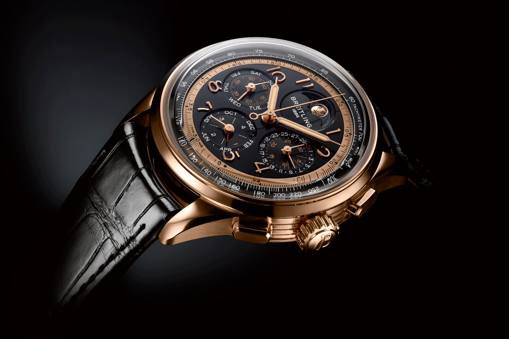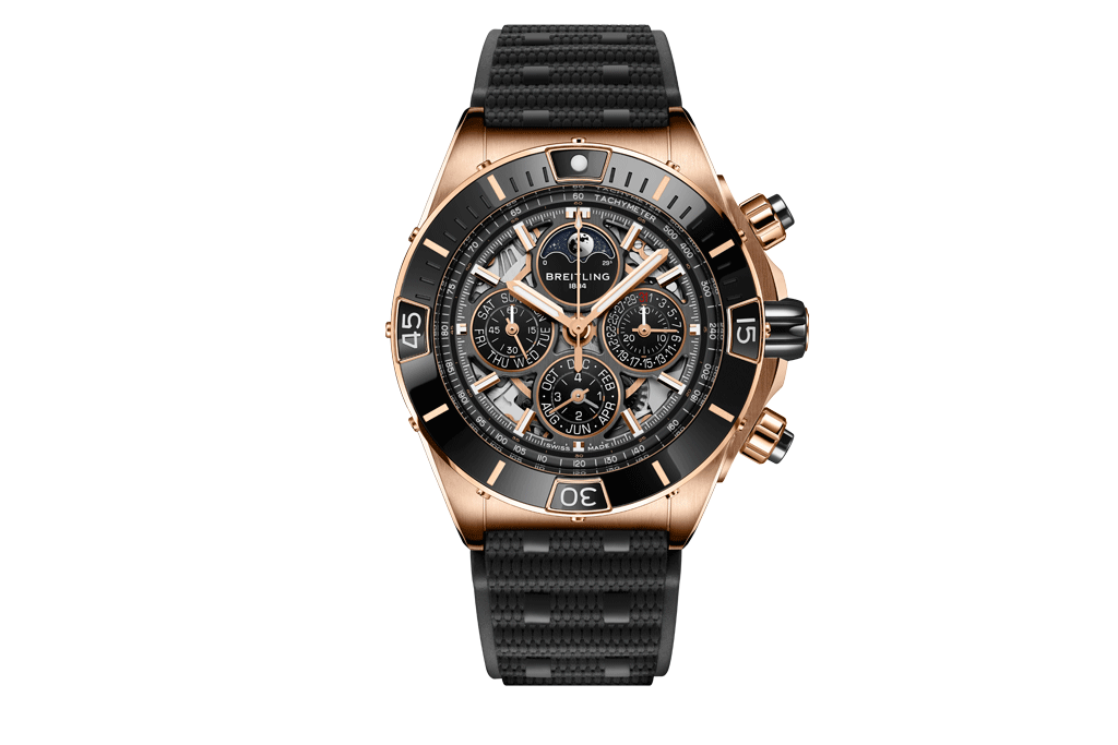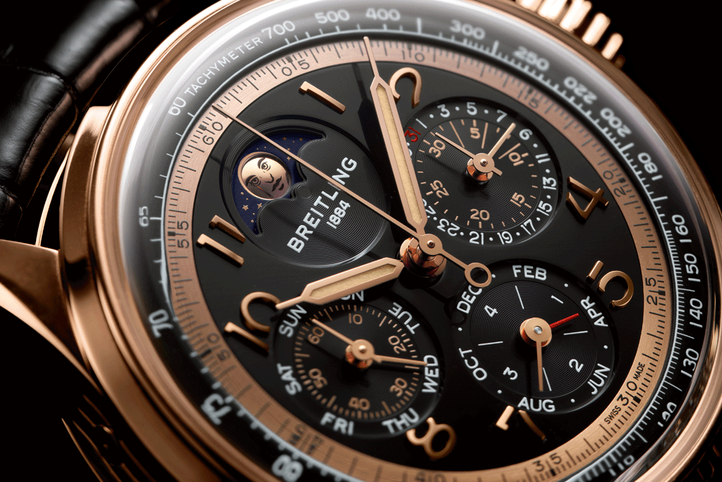 Das neue Kaliber B19 ist das erste exklusive Uhrwerk der Marke mit ewigem Kalender, und natürlich ist es auch ein Chronograph – Breitlings Spezialgebiet von Anfang an. Es verfügt über Vollkalender und Mondphase, korrigiert automatisch Monate mit 28, 30 und 31 Tagen sowie Schaltjahre und kann daher fast 100 Jahre lang ohne größere Anpassungen laufen. Hinzu kommt eine bemerkenswerte Gangreserve von circa 96 Stunden.
