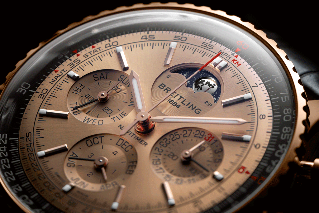 „Navitimer B19 Chronograph 43 Perpetual Calendar 140th Anniversary“: Die „Navitimer“ war die erste Pilotenuhr, die einen Chronographen mit dem markeneigenen kreisförmigen Rechenschieber-Bordcomputer kombinierte.