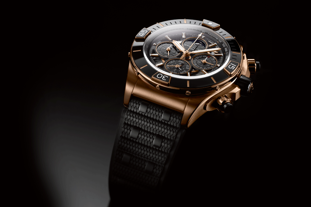 Die Jubiläumsedition mit 43-Millimeter-Gehäuse aus massivem 18-karätigen Rotgold verfügt über den berühmten Rechenschieber in Schwarz mit einem auffälligen Zifferblatt aus 18-karätigem Rotgold. Das Armband besteht aus Alligatorleder mit Kontrastnaht und einer Faltschließe aus 18-karätigem Gold.