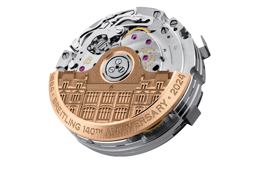 Den Rotor aus Massivgold ziert eine Gravur der historischen Breitling-Manufaktur in der Rue de Montbrillant im schweizerischen La Chaux-de-Fonds. Montbrillant war mehr als eine Fabrik: Ihr Westflügel war ein Gebäude im Stil einer Villa, in dem drei Generationen der Familie Breitling wohnten. Das Montbrillant-Gebäude, das über 80 Jahre lang als Manufaktur der Marke diente, hatte einen Ehrenplatz in den Werbeanzeigen des Unternehmens. Sein Name war in den 1930er- und 1940er-Jahren sogar auf Zifferblättern zu sehen.