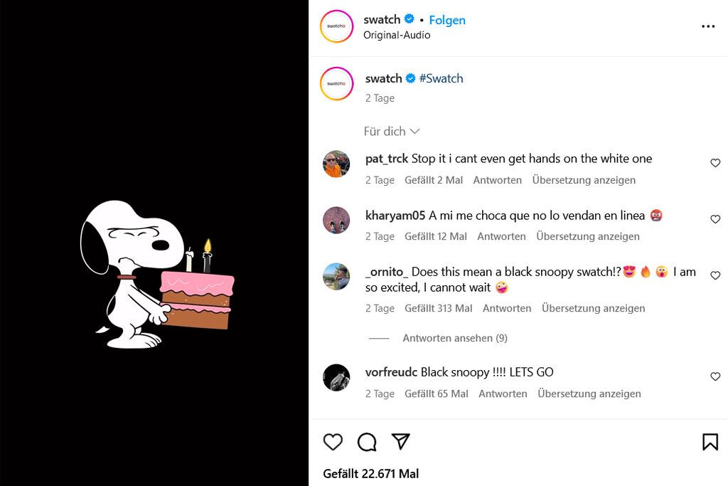 In diesem versucht er, auf einer Torte mit einer weißen, bereits erloschenen Kerze die schwarze Kerze auszupusten – vergeblich. Die einhellige Meinung: Der Launch einer „Black Snoopy MoonSwatch“ steht bevor.